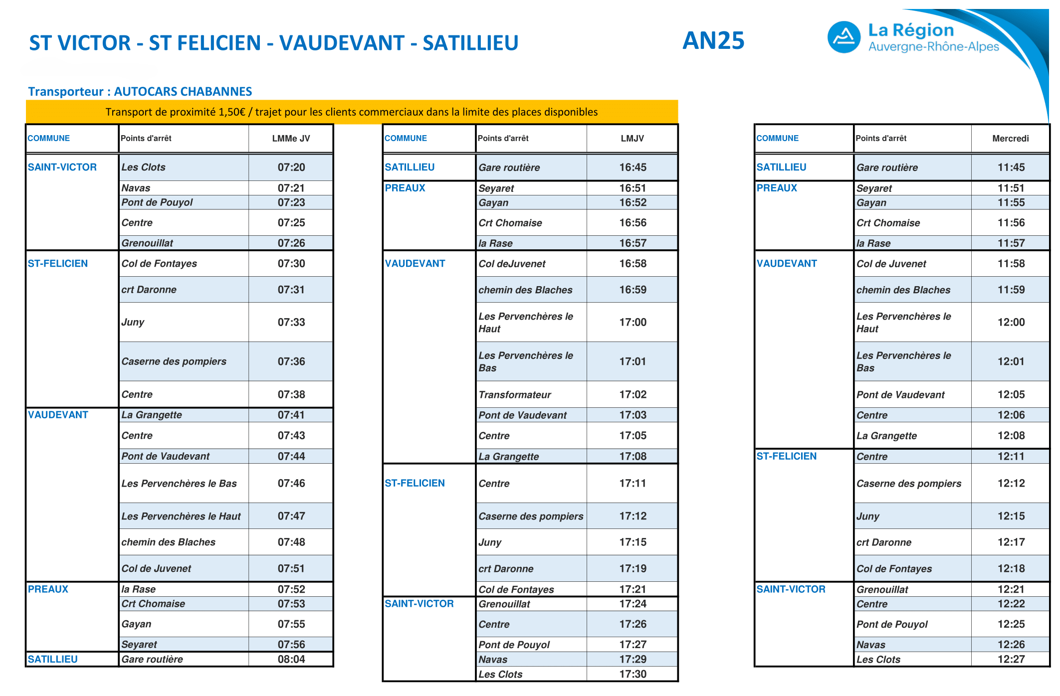 Ligne AN25 : LES CLOTS -> ST VICTOR -> ST FELICIEN -> VAUDEVANT -> SATILLIEU